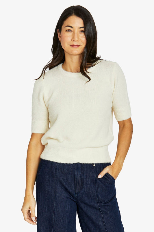 Fluffy Short Sleeve Crew Knit Top in Pearl